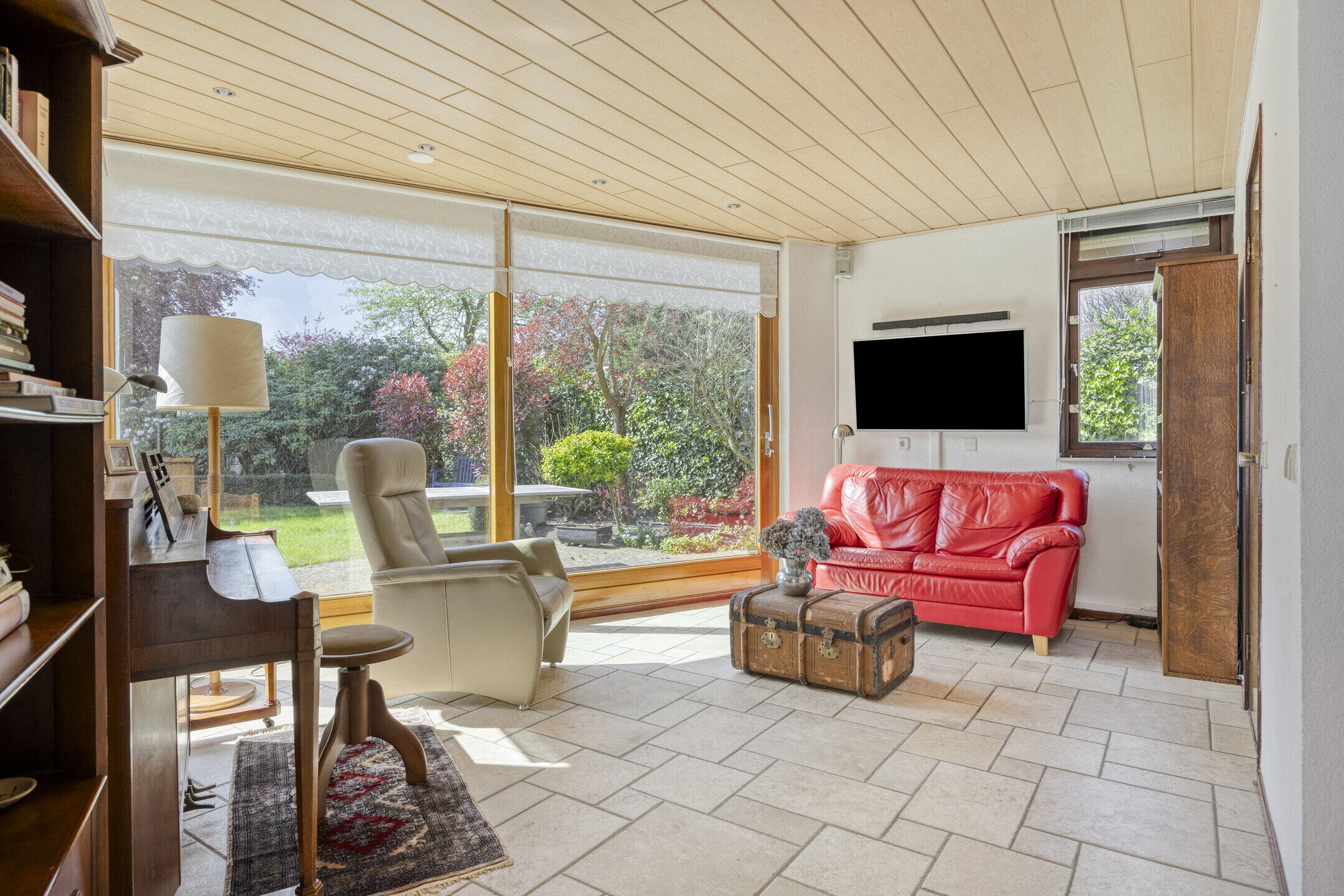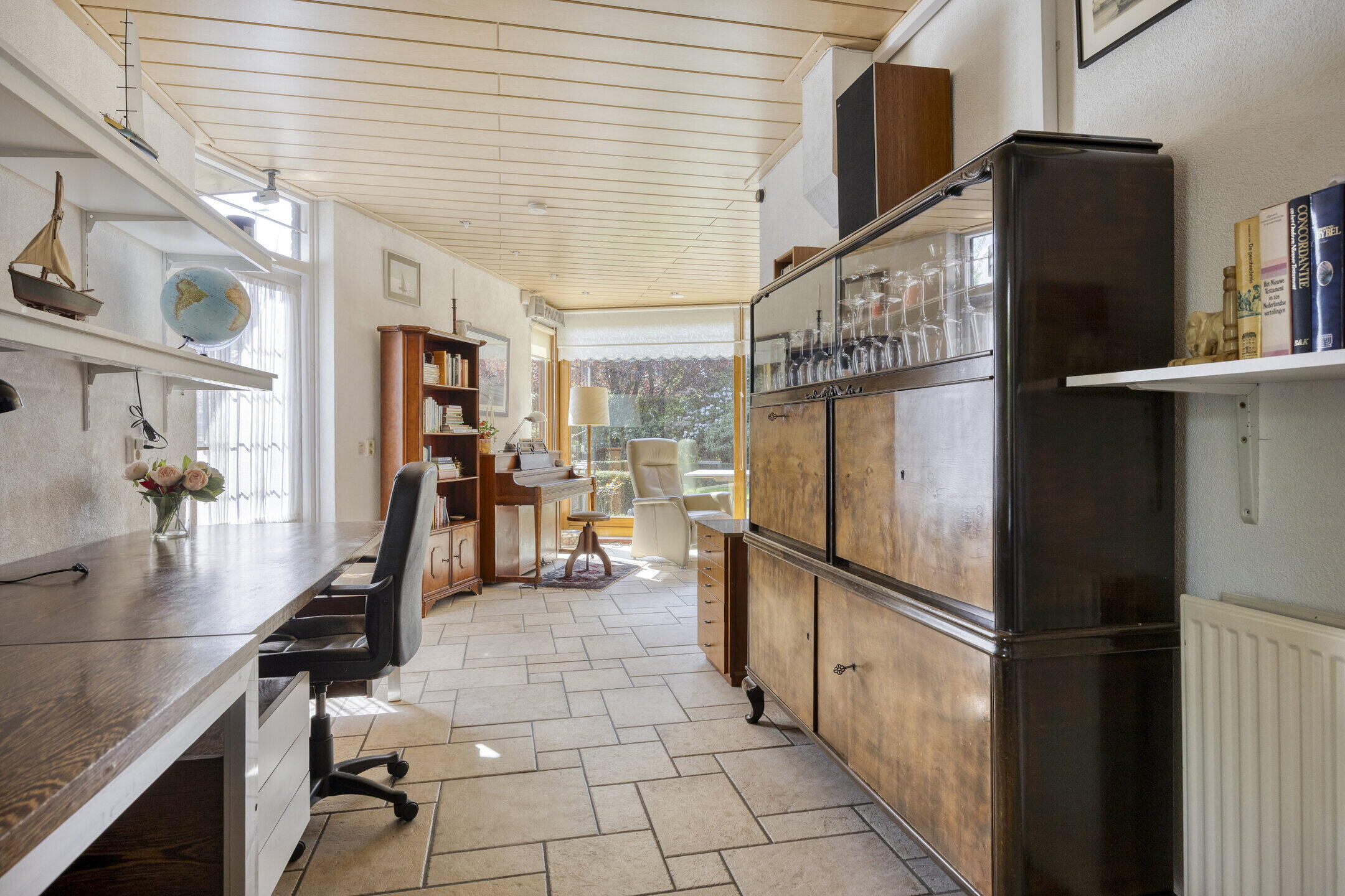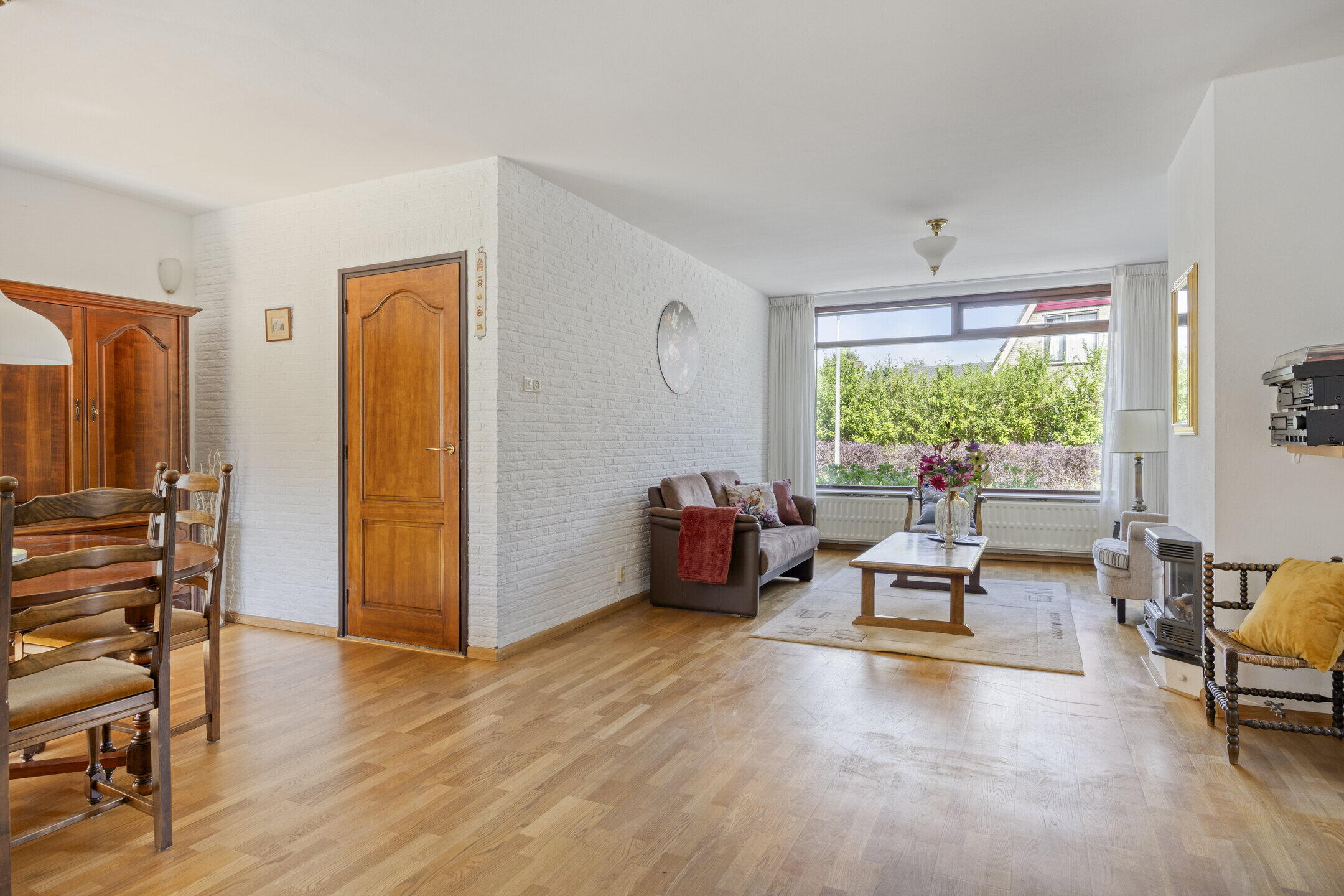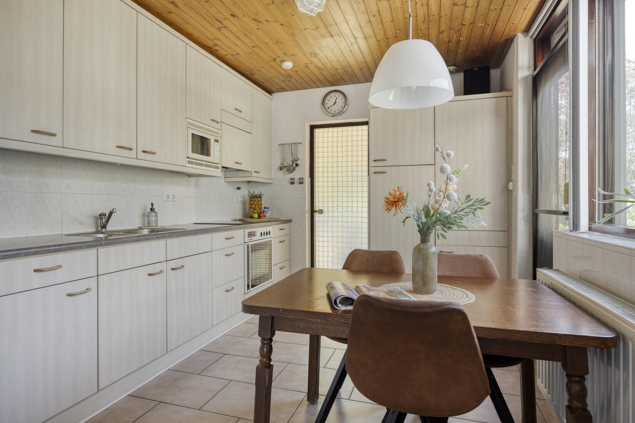 De woonkamer is opvallend ruim en biedt volop mogelijkheden voor het creëren van meerdere gezellige zithoeken. Dankzij de grote ramen geniet je hier van een prachtige lichtinval. De gaskachel zorgt voor extra sfeer en warmte tijdens de koudere dagen. Aangrenzend vind je een extra kamer die momenteel dienstdoet als hobby- en werkruimte. Deze lichte ruimte met uitzicht op de tuin is ideaal om je even terug te trekken of juist als verlengstuk van de woonkamer te gebruiken. De keuken bevindt zich in een aparte ruimte en is netjes afgewerkt. Hier heb je volop werk- en opbergruimte én plek voor een gezellige eethoek om de dag goed te beginnen. Aansluitend vind je de praktische bijkeuken met extra bergruimte en een wasmachineaansluiting.