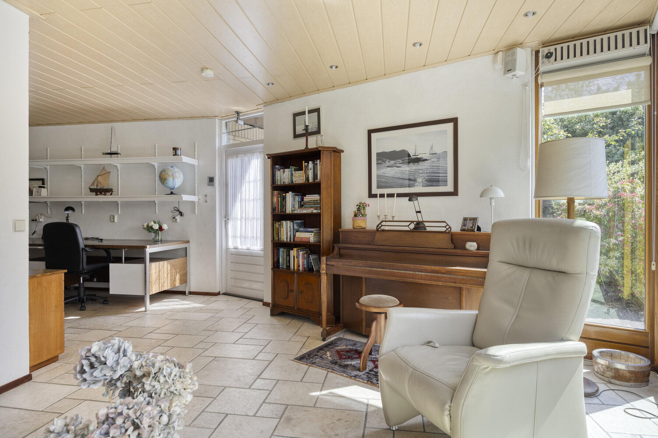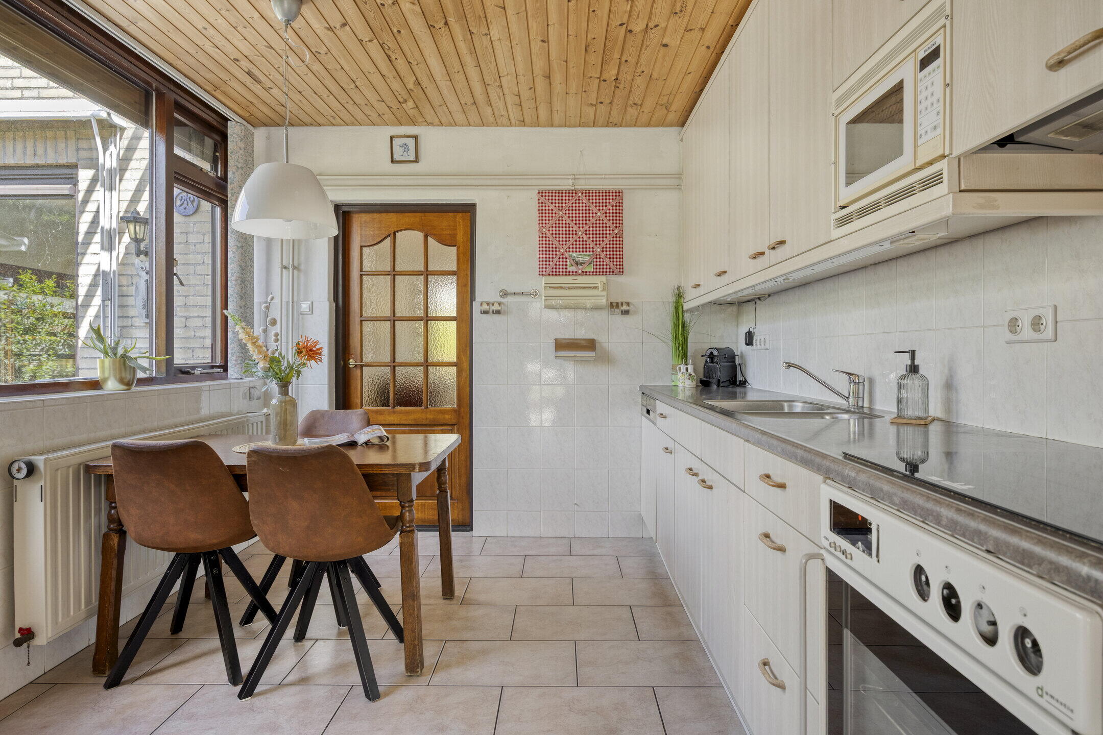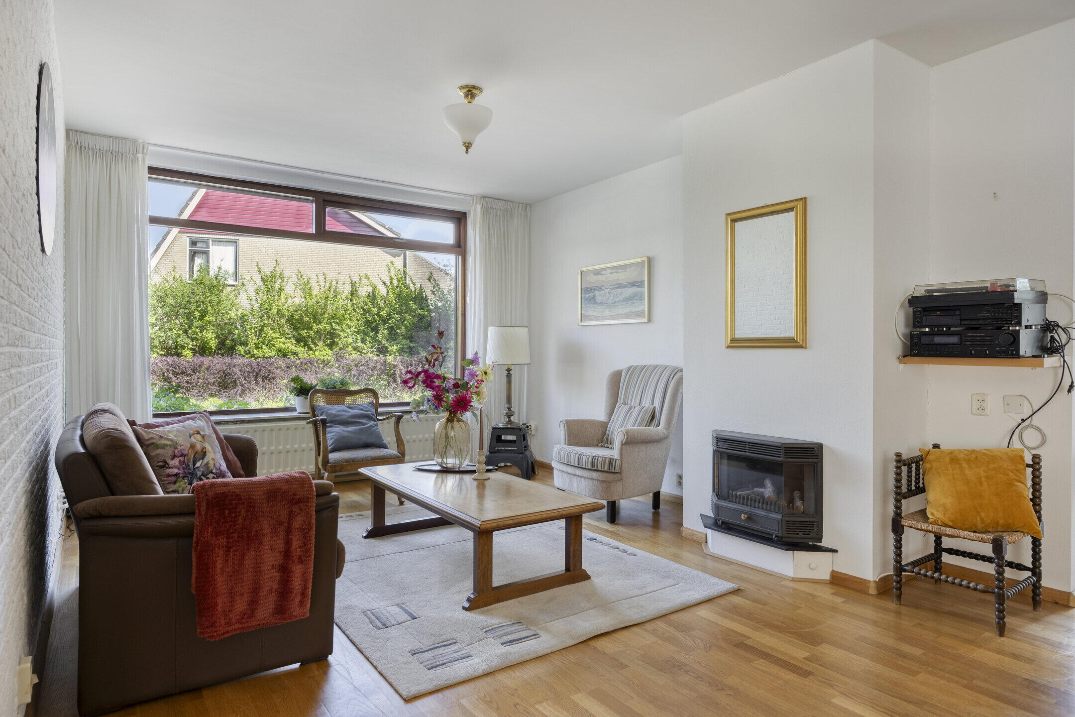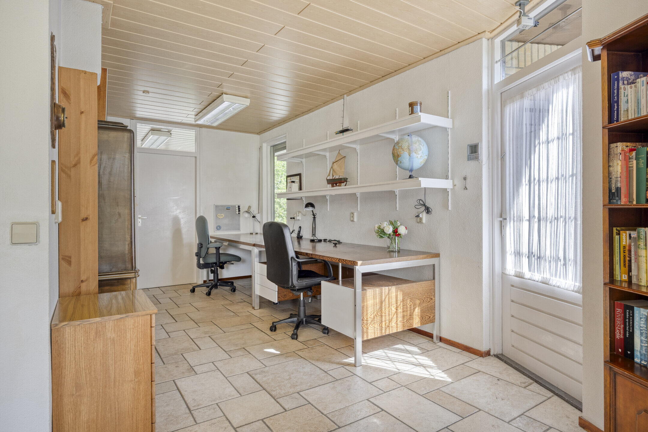 De woonkamer is opvallend ruim en biedt volop mogelijkheden voor het creëren van meerdere gezellige zithoeken. Dankzij de grote ramen geniet je hier van een prachtige lichtinval. De gaskachel zorgt voor extra sfeer en warmte tijdens de koudere dagen. Aangrenzend vind je een extra kamer die momenteel dienstdoet als hobby- en werkruimte. Deze lichte ruimte met uitzicht op de tuin is ideaal om je even terug te trekken of juist als verlengstuk van de woonkamer te gebruiken. De keuken bevindt zich in een aparte ruimte en is netjes afgewerkt. Hier heb je volop werk- en opbergruimte én plek voor een gezellige eethoek om de dag goed te beginnen. Aansluitend vind je de praktische bijkeuken met extra bergruimte en een wasmachineaansluiting.
