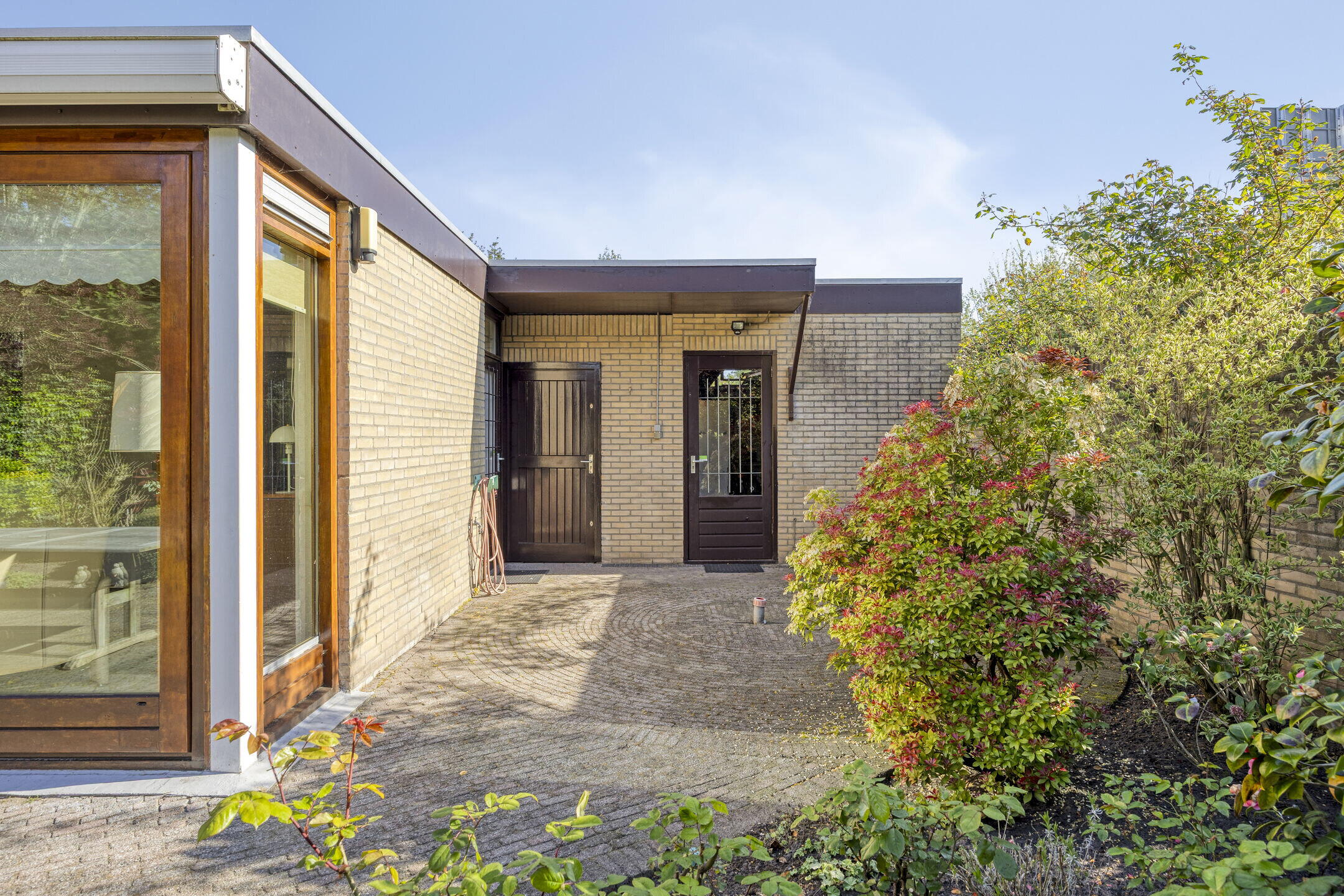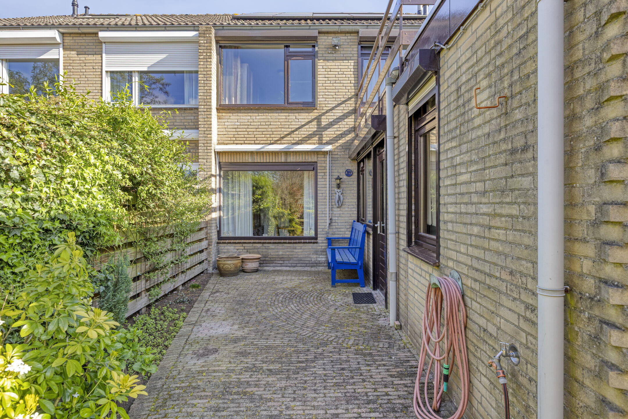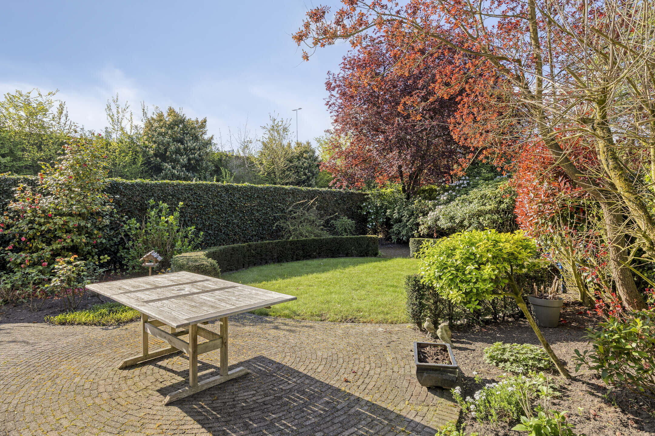 De achtertuin is keurig aangelegd met een mooie combinatie van bestrating en groen. Je geniet hier van veel privacy en sfeervolle beplanting. De speelse indeling met een rond pad van struiken zorgt voor een ruimtelijk en gezellig gevoel — een heerlijke plek om te ontspannen.