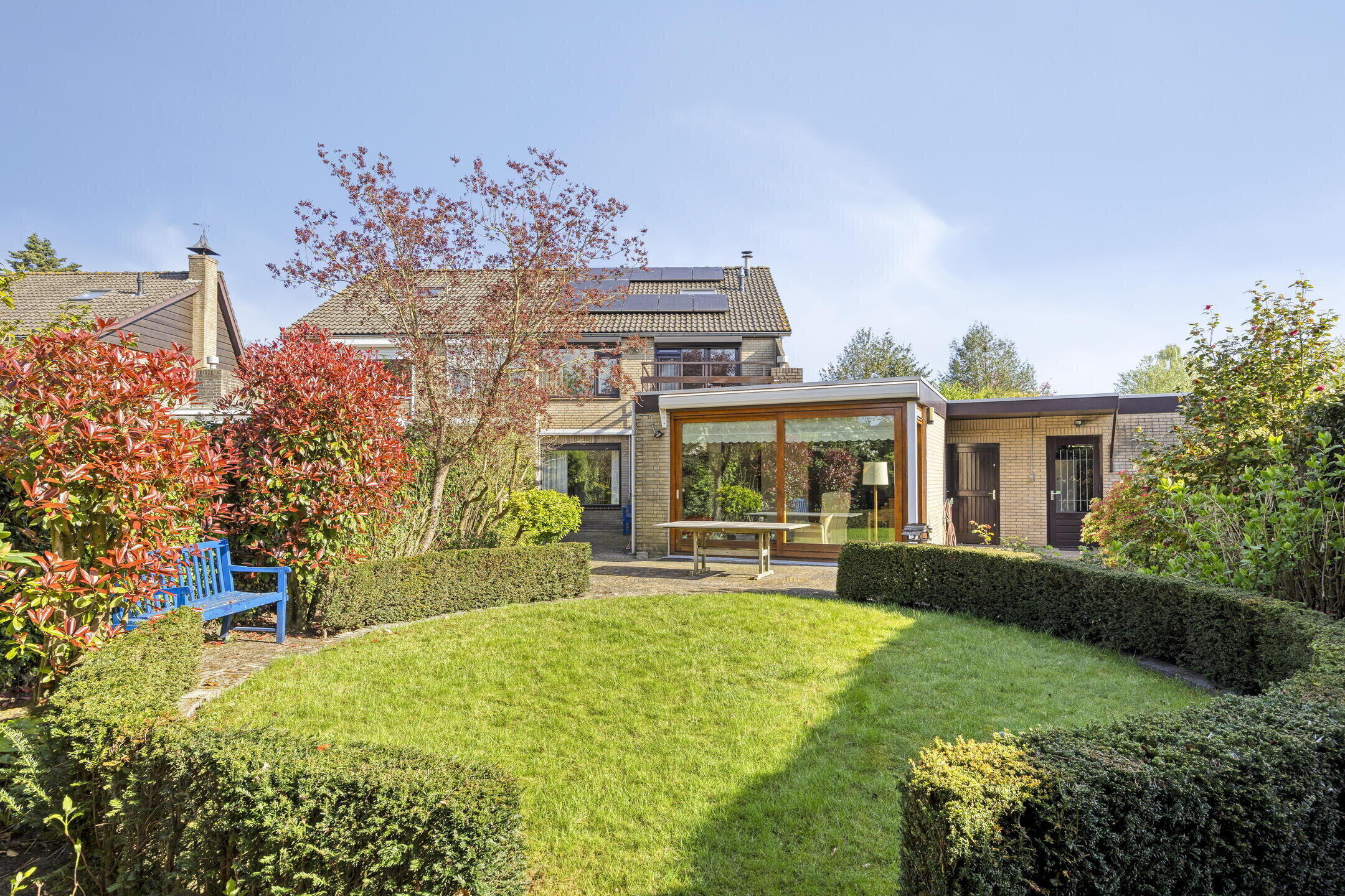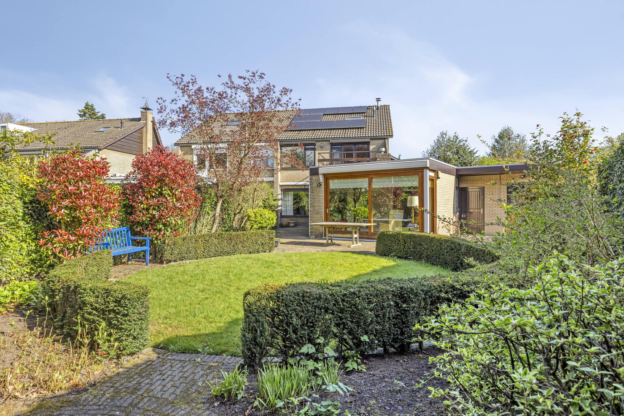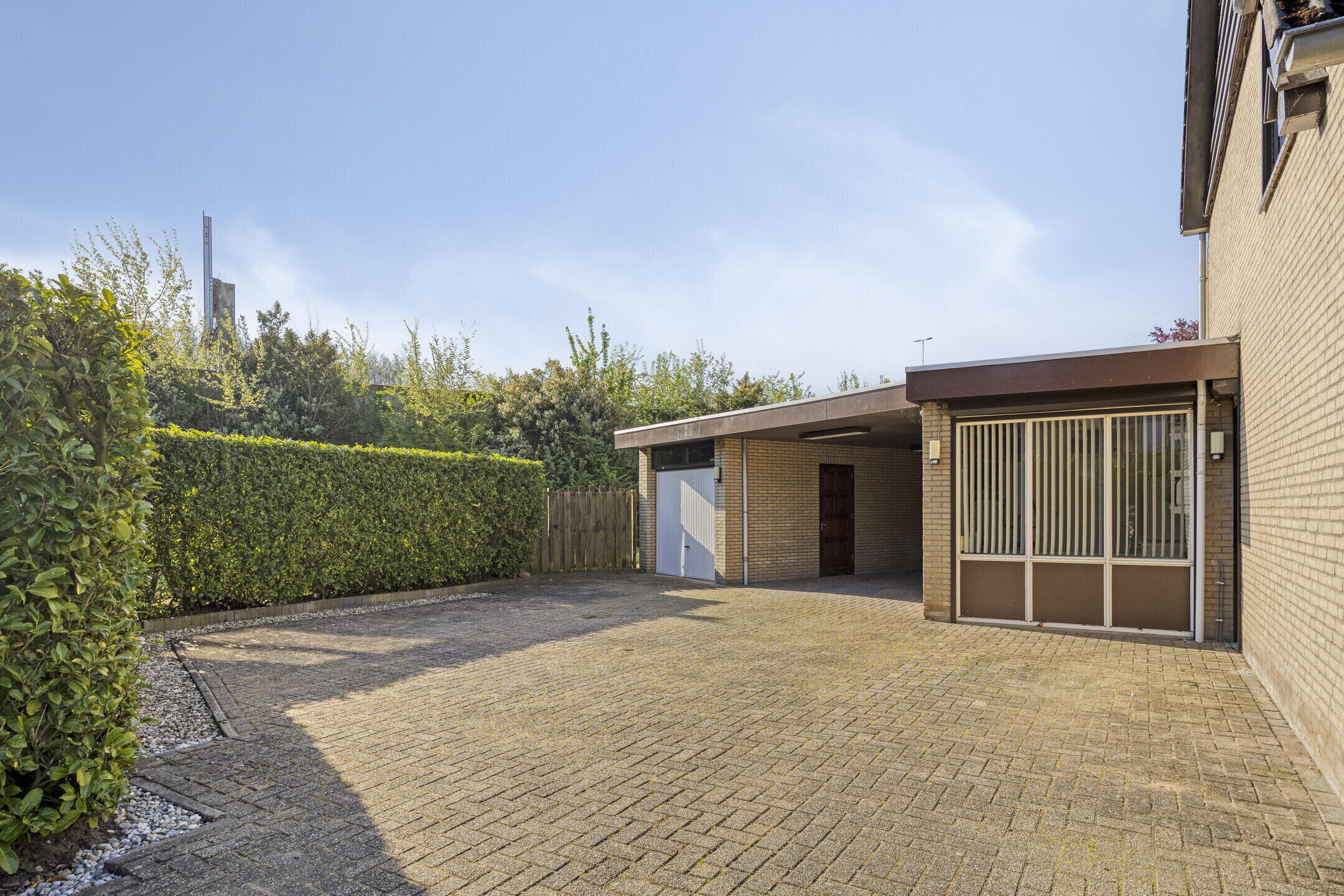 De achtertuin is keurig aangelegd met een mooie combinatie van bestrating en groen. Je geniet hier van veel privacy en sfeervolle beplanting. De speelse indeling met een rond pad van struiken zorgt voor een ruimtelijk en gezellig gevoel — een heerlijke plek om te ontspannen.