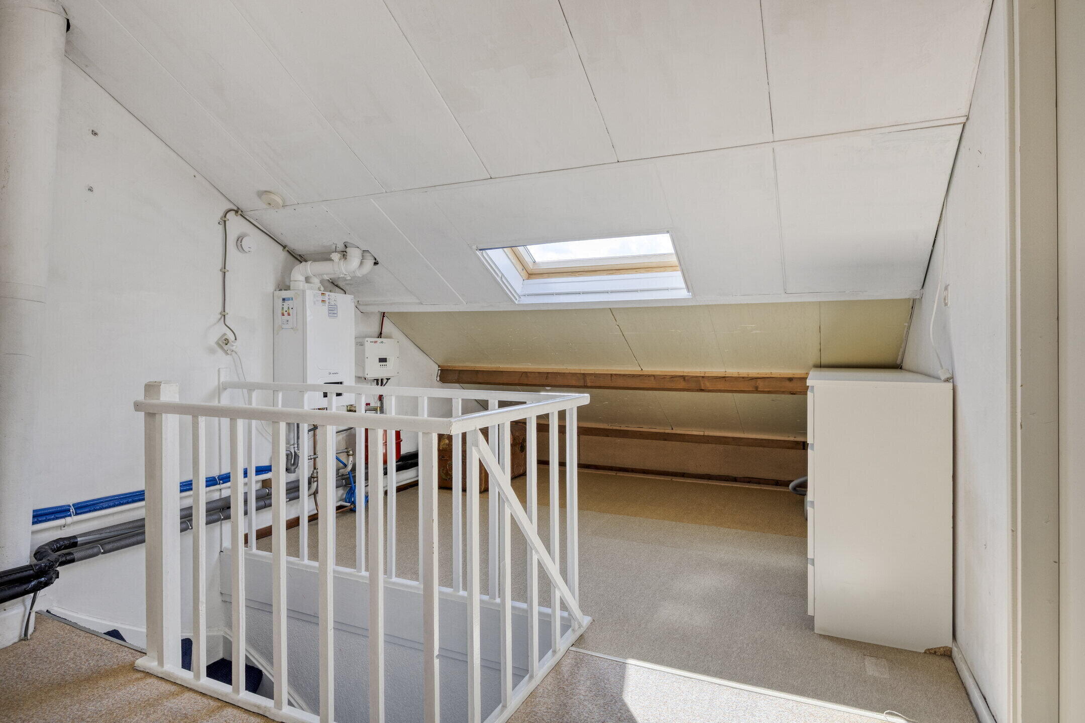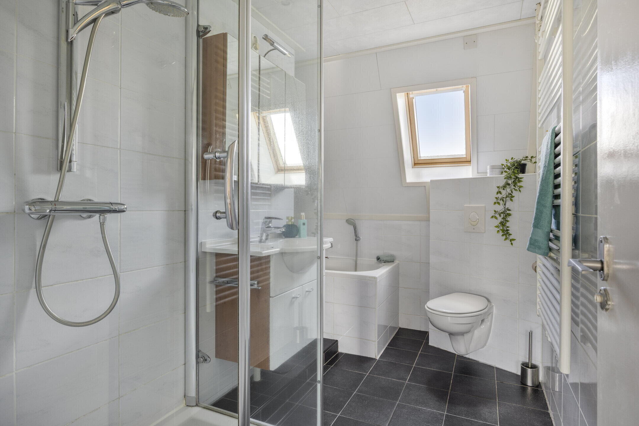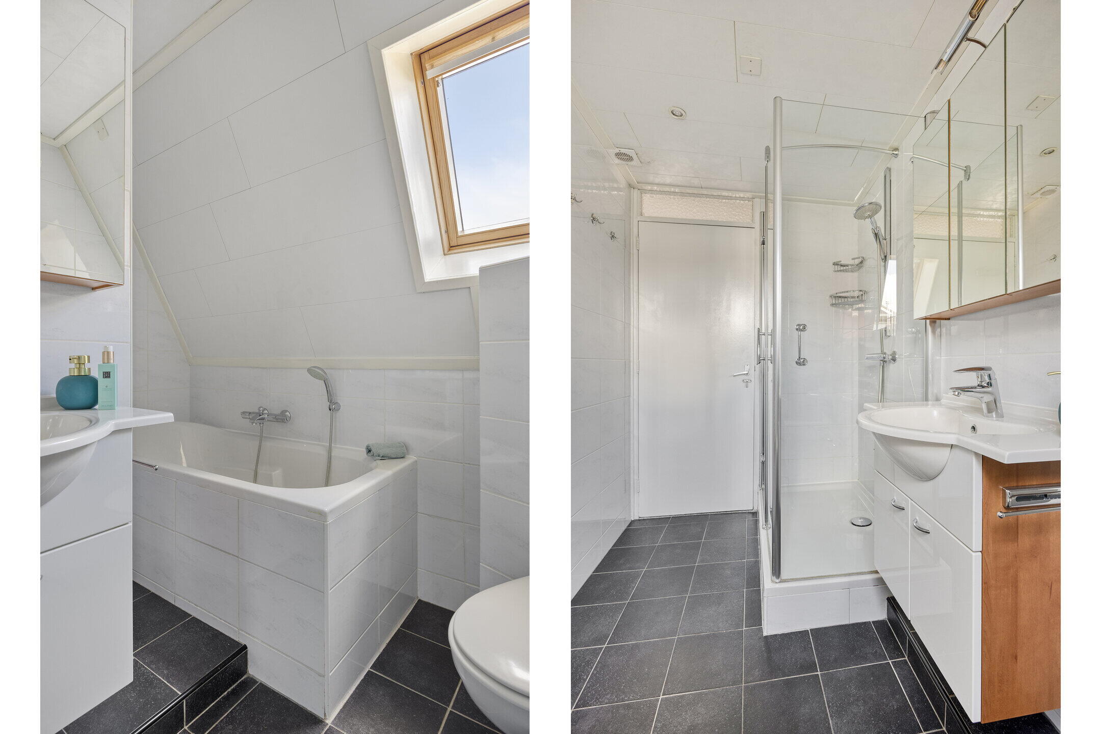 Op de eerste verdieping bevinden zich drie ruime slaapkamers, allemaal voorzien van vloerbedekking en een fijne lichtinval. Eén van de slaapkamers beschikt over een eigen balkon — een heerlijke plek om van de zon te genieten. De badkamer is verzorgd en stijlvol met een combinatie van zwarte vloertegels en witte wandtegels. Je vindt hier een toilet, douche, wastafelmeubel en een slim ingedeeld ligbad dat nauwelijks ruimte inneemt. Via een vaste trap bereik je de tweede verdieping, waar een vierde slaapkamer is gerealiseerd. Deze ruimte is naar eigen smaak in te richten en biedt opnieuw voldoende daglicht.