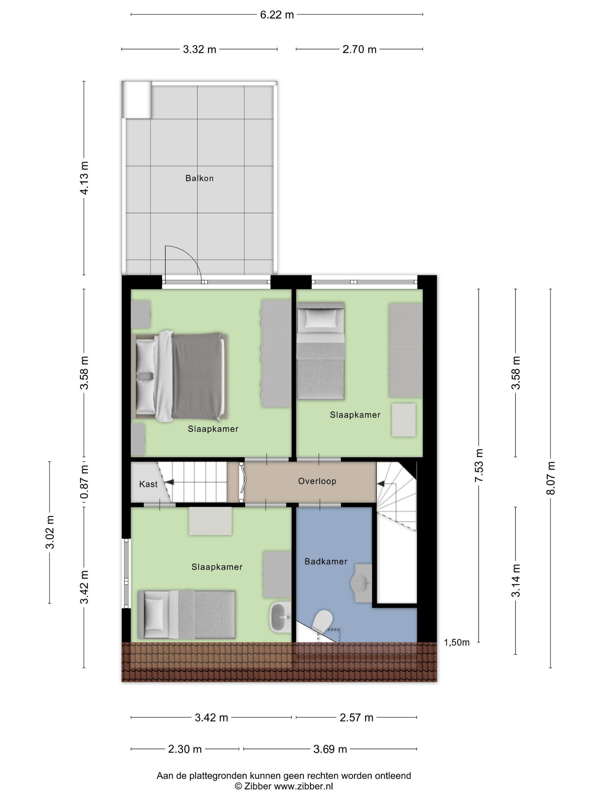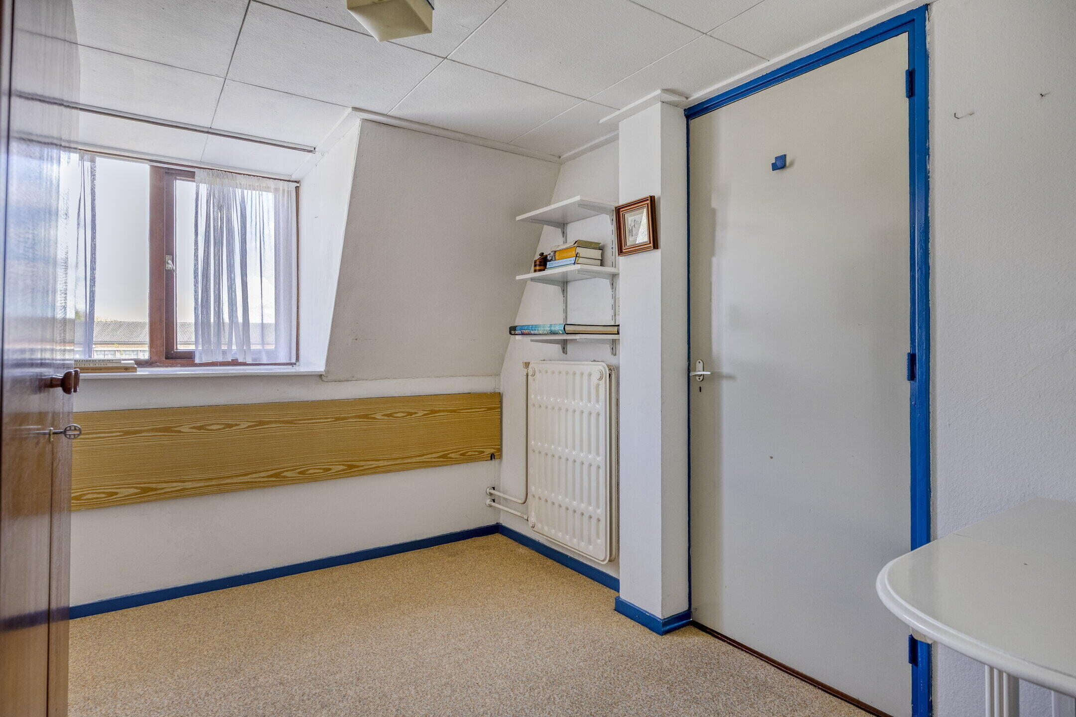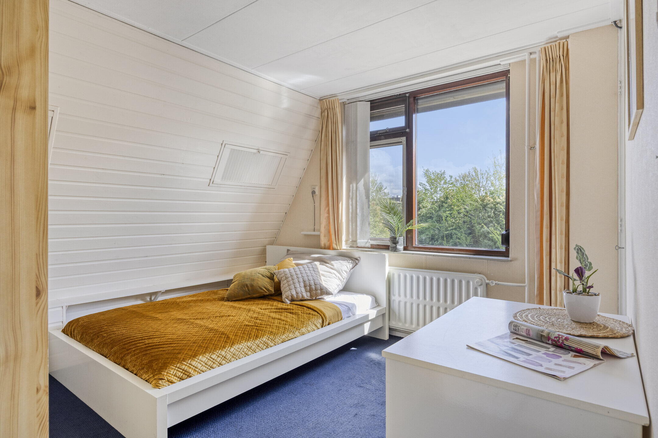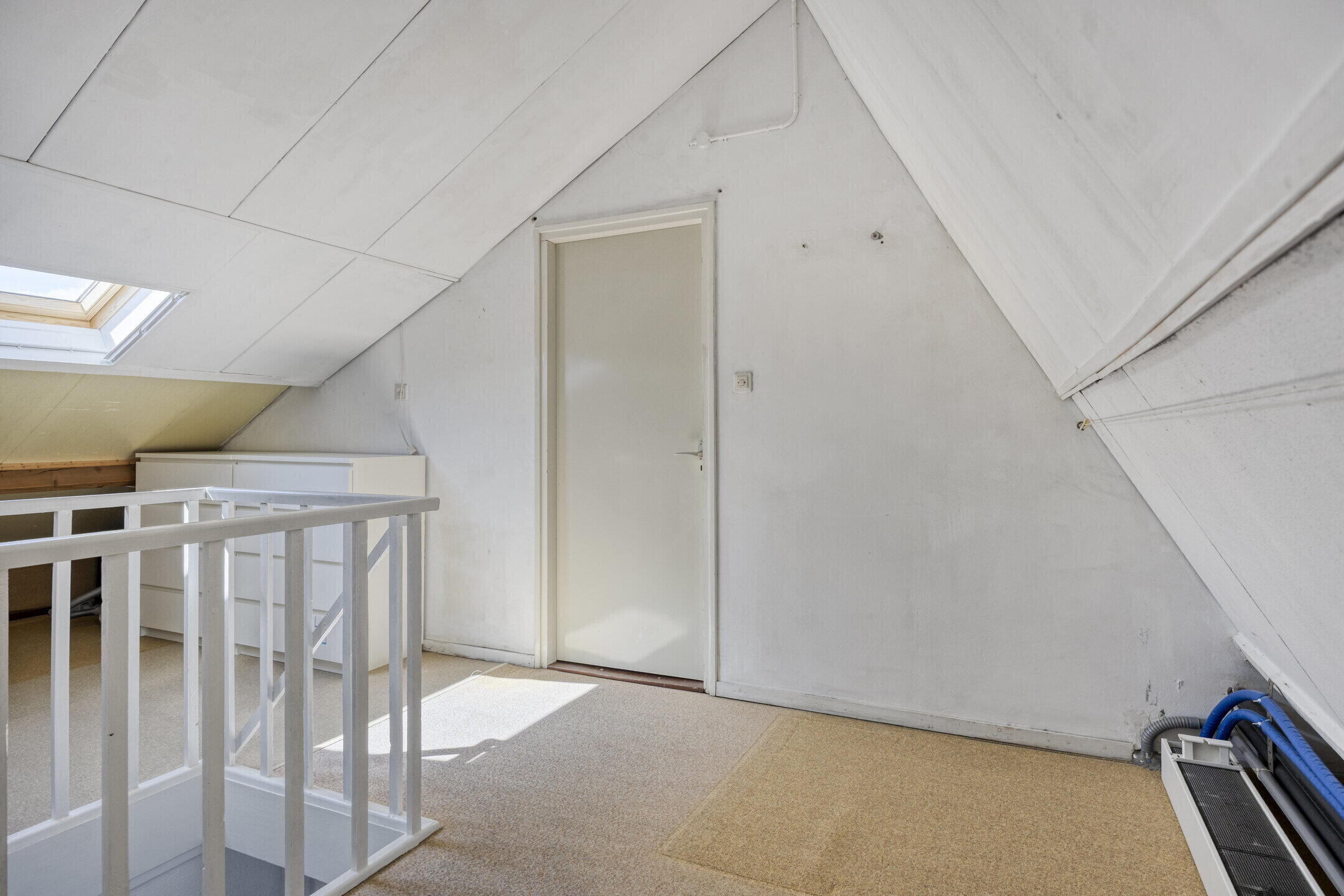 Op de eerste verdieping bevinden zich drie ruime slaapkamers, allemaal voorzien van vloerbedekking en een fijne lichtinval. Eén van de slaapkamers beschikt over een eigen balkon — een heerlijke plek om van de zon te genieten. De badkamer is verzorgd en stijlvol met een combinatie van zwarte vloertegels en witte wandtegels. Je vindt hier een toilet, douche, wastafelmeubel en een slim ingedeeld ligbad dat nauwelijks ruimte inneemt. Via een vaste trap bereik je de tweede verdieping, waar een vierde slaapkamer is gerealiseerd. Deze ruimte is naar eigen smaak in te richten en biedt opnieuw voldoende daglicht.